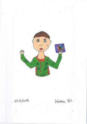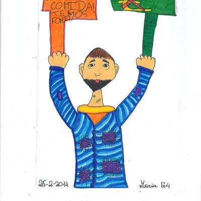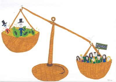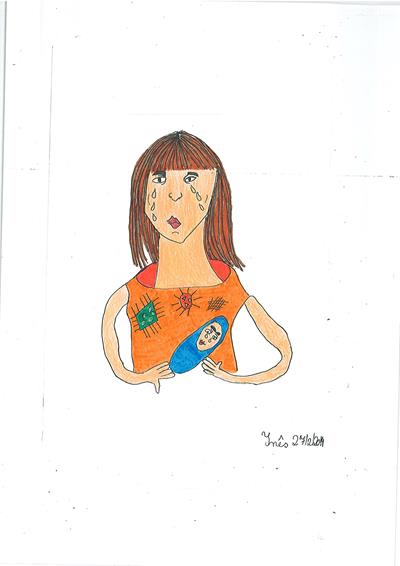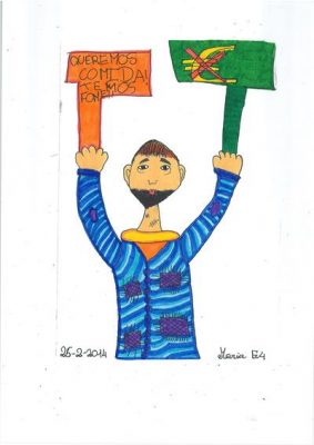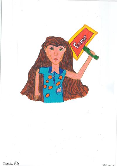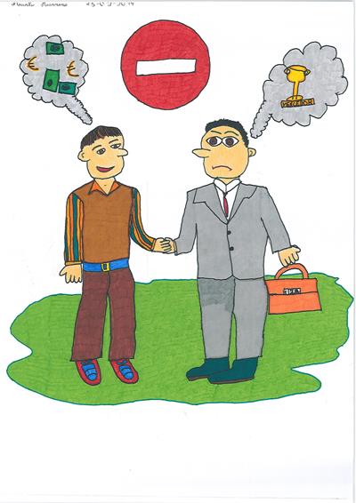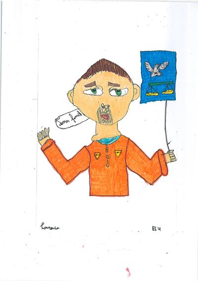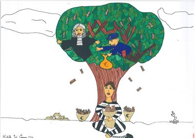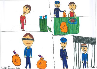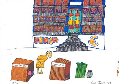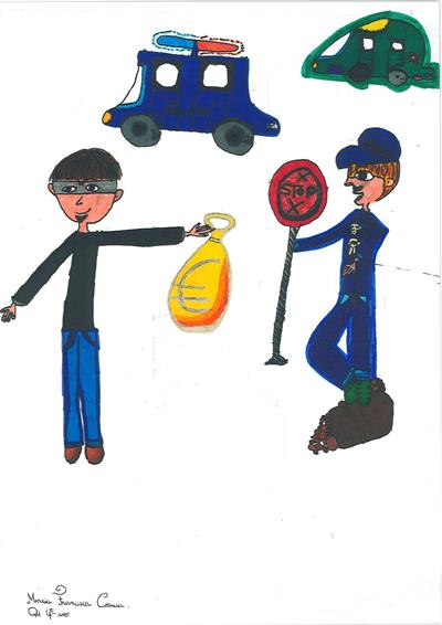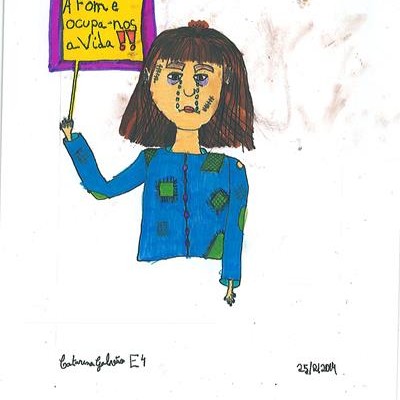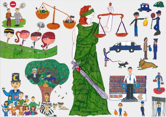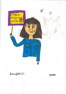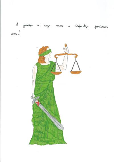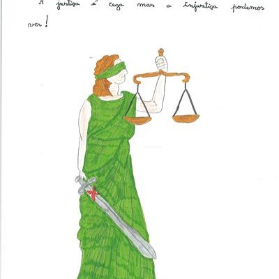Abordámos o conceito de corrupção com exemplos de obstrução à justiça e suborno. A partir daí os alunos realizaram os desenhos, os quais foram seleccionados e organizados num painel colectivo. Neste encontra-se representada a simbologia da justiça, personificada na cor da esperança, ao redor da qual são retratadas situações relacionadas com a temática.