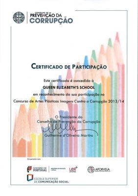 Nesta galeria encontram-se os trabalhos realizados pelos alunos do 4º ano da Queen Elizabeth’s School, desenvolvidos nas aulas de expressão e educação plástica orientadas pela Mrs. Ana Maria Nunes, a partir dos quais foi produzido um painel coletivo que foi enviado no passado dia 7 de março para o concurso nacional de artes plásticas “Imagens Contra a Corrupção”, promovido pelo Tribunal de Contas de Portugal e pelo Conselho de Prevenção da Corrupção.